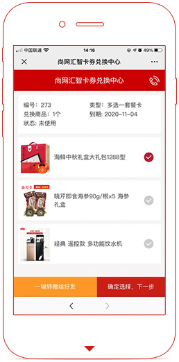 尚網匯智提貨系統適用于節日禮品兌換、大閘蟹提貨、海鮮提貨、水果提貨、茶葉提貨、大米提貨、農產品提貨、月餅等提貨用途,以及禮券提貨、禮品卡、提貨卡等全平臺覆蓋的專業卡券解決方案。